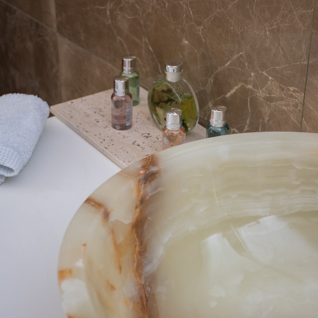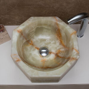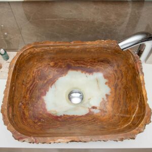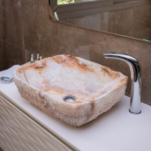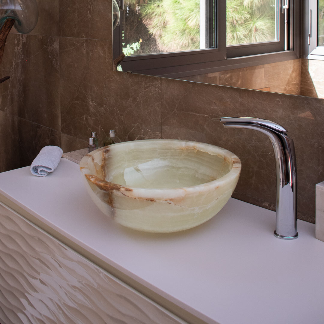 Il nostro esclusivo lavabo a bacinella in onice, realizzato in pietra naturale dalla forma rotonda, è perfetto per qualsiasi ambiente, che si tratti di un loft o di un bagno contemporaneo. Questo lavabo in pietra fatto a mano, realizzato con il più pregiato marmo onice, è un esempio di eleganza e design senza tempo. La classica silhouette a bacinella del lavabo conferisce un’atmosfera elegante al vostro santuario personale. Godetevi il tocco lussuoso della pietra naturale, disponibile nelle tonalità distintive del Verde Amazzonia e del Verde Galassia. Ogni lavabo in onice presenta motivi e venature unici, garantendo che i vostri rituali quotidiani siano circondati da bellezza e comfort su misura. I nostri lavabi fatti a mano, con il fascino del singolare marmo onice, fondono l’artigianato tradizionale con l’estetica moderna.