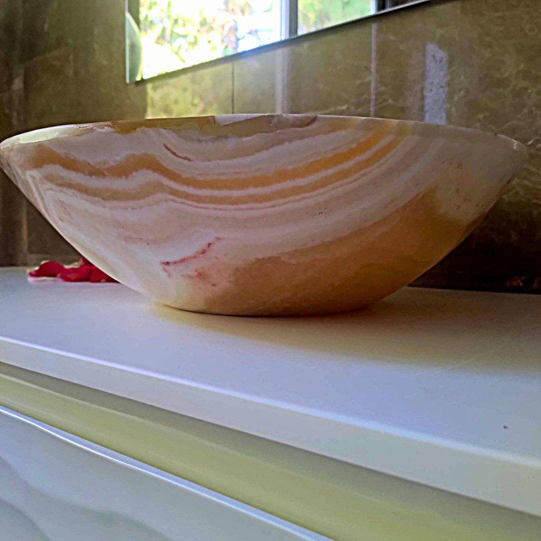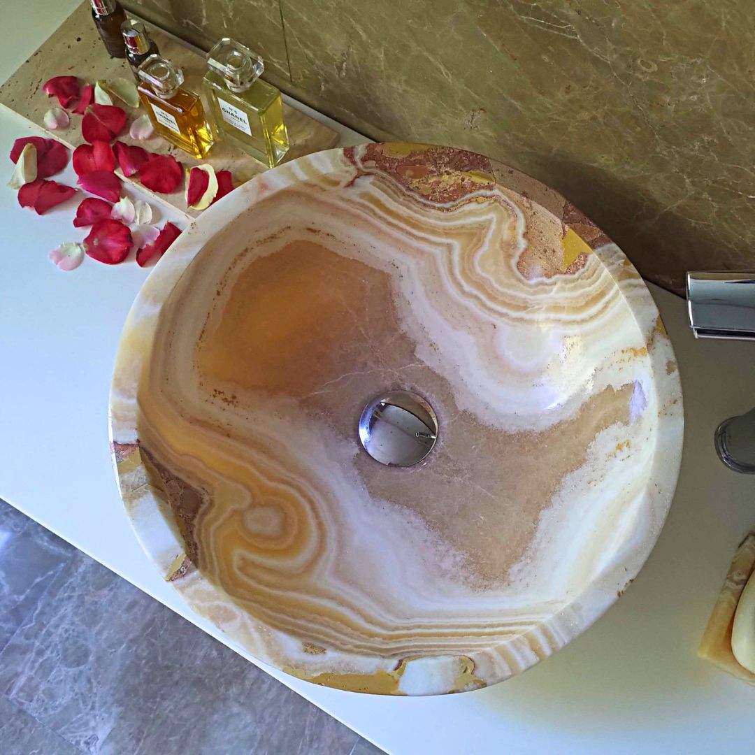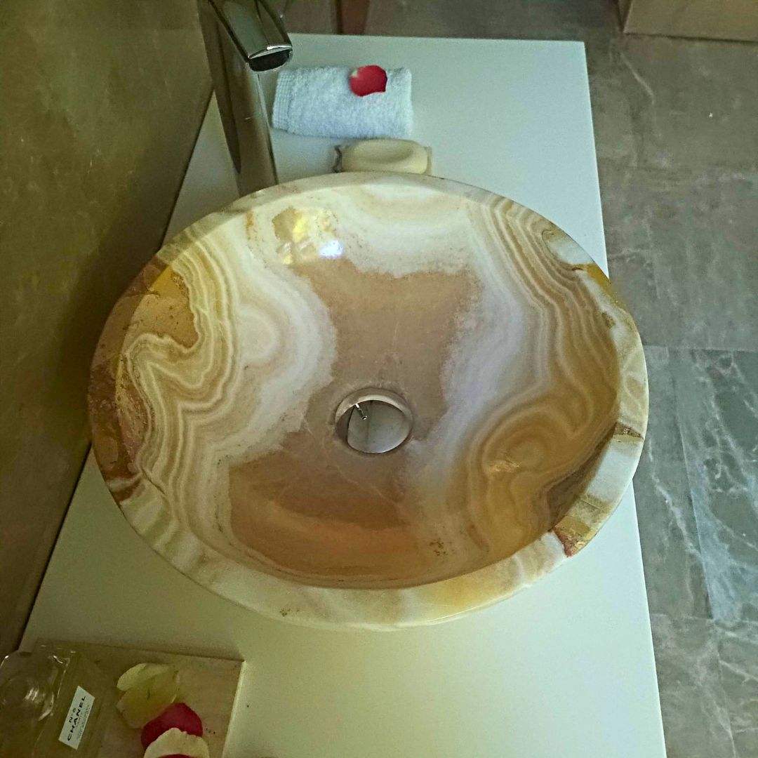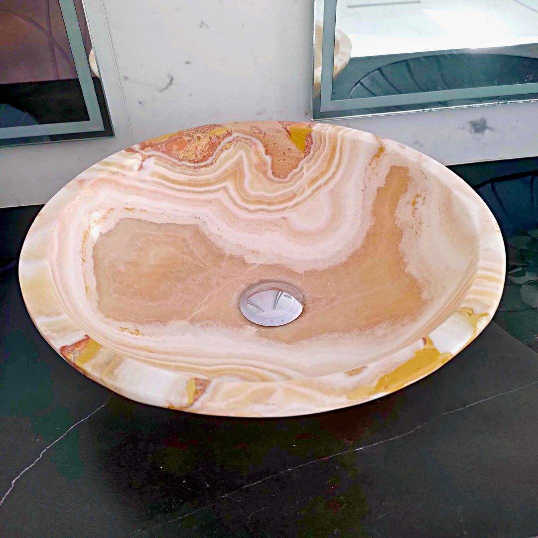 Ogni pezzo è scolpito a mano dai nostri maestri artigiani, esaltando le venature e le sfumature uniche dell’onice per creare un’estetica irripetibile. Progettato per l’installazione su piano lavabo, aggiunge un tocco di raffinatezza e lusso a qualsiasi stile di bagno.
